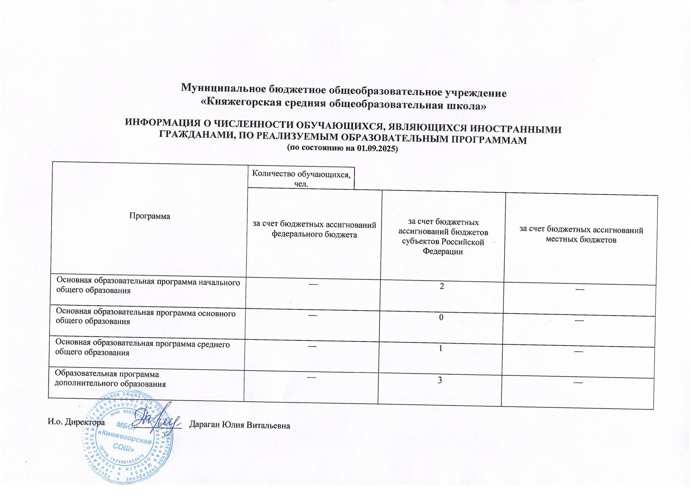 | Ф.И.О. руководителя ОУ | Дараган Юлия Витальевна |